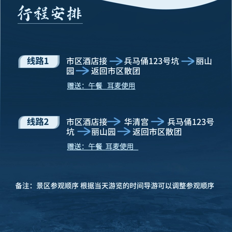 本产品坚持“纯玩”原则,全程无任何购物店停留,所有时间均用于参观兵马俑、丽山园、华清宫等核心景点。对于差旅人士而言,这意味着可精准预估行程时长,便于与工作会议、航班衔接。无需担心被强制消费或行程拖沓,真正实现高效、纯粹的文化度假体验,让每一分差旅时间都物有所值。