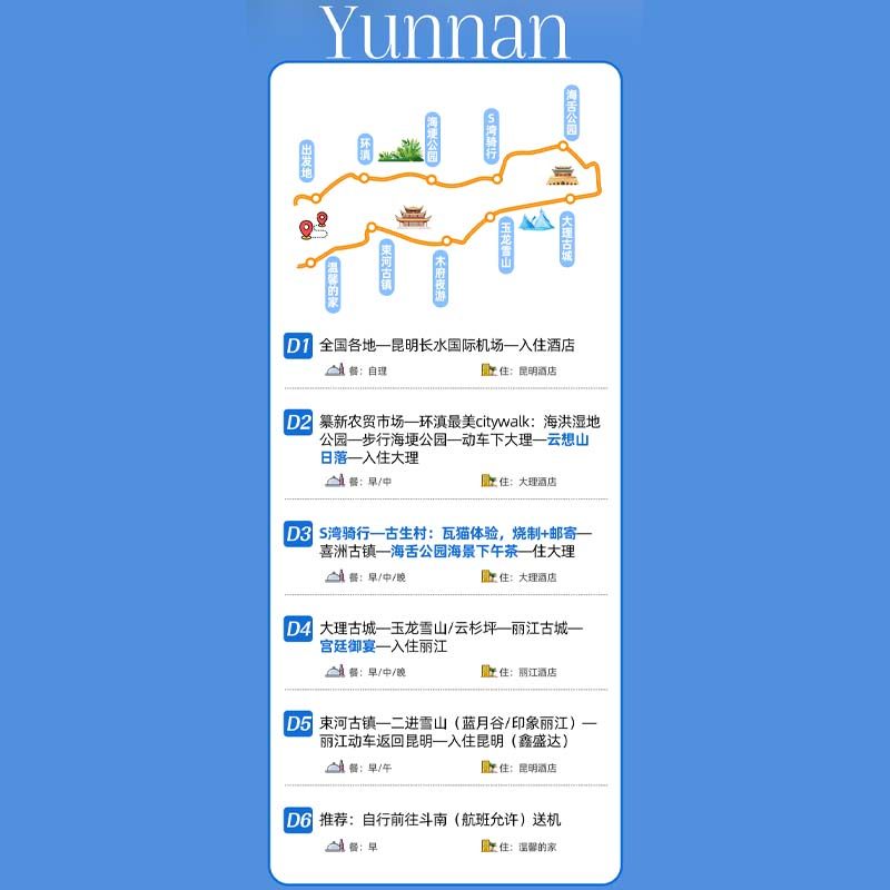 本行程专为差旅人士设计,支持从上海、北京、广州、成都等全国26个主要城市出发,直飞昆明或丽江,大幅节省中转时间与精力。无论您刚结束一场商务会议,还是在周末间隙寻求放松,都能快速衔接航班,实现‘下班即出发’的高效度假体验。全程含往返机票,免除繁琐预订环节,让差旅与休闲无缝切换。