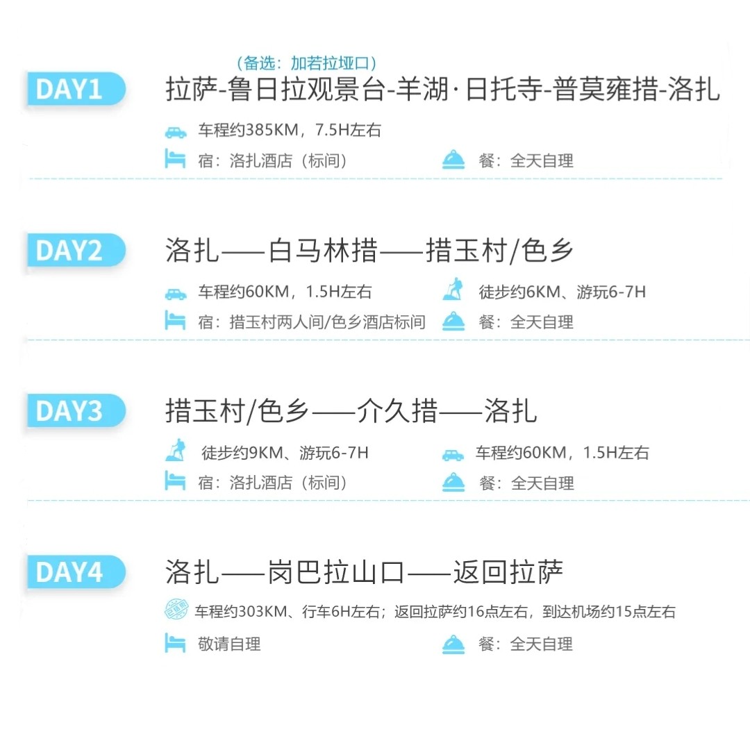 行程途经鲁日拉、白马林措、普莫雍措等多个观景点,每个位置都可拍摄到不同角度的雪山倒影与湖光山色,是摄影爱好型差旅人士的理想选择。无论是用于社交分享还是个人收藏,都能收获极具视觉冲击力的作品。