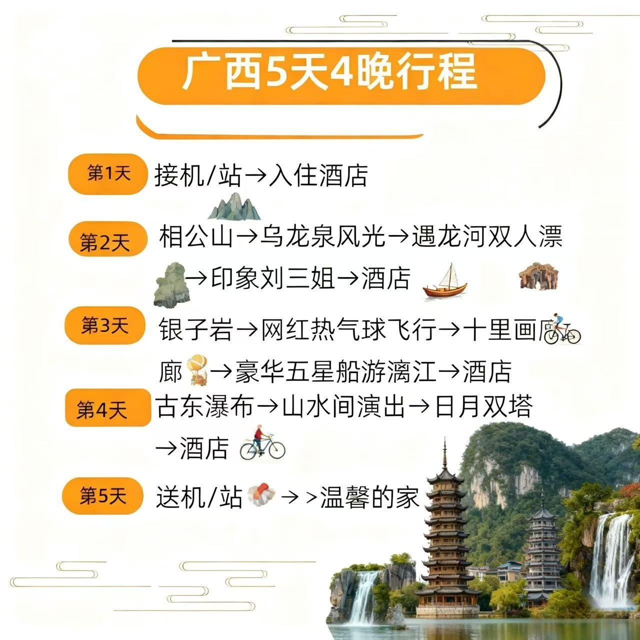 专为时间宝贵的差旅人群设计,精选桂林最具代表性的核心景点:相公山观云海日出、遇龙河双人漂流体验诗意山水、漓江五星豪华游船饱览百里画廊、古东瀑布亲水徒步、日月双塔夜景打卡。无需自行规划路线,5天4晚高效串联,既满足深度体验,又避免无效奔波,让差旅之余的假期每一分钟都物有所值。
