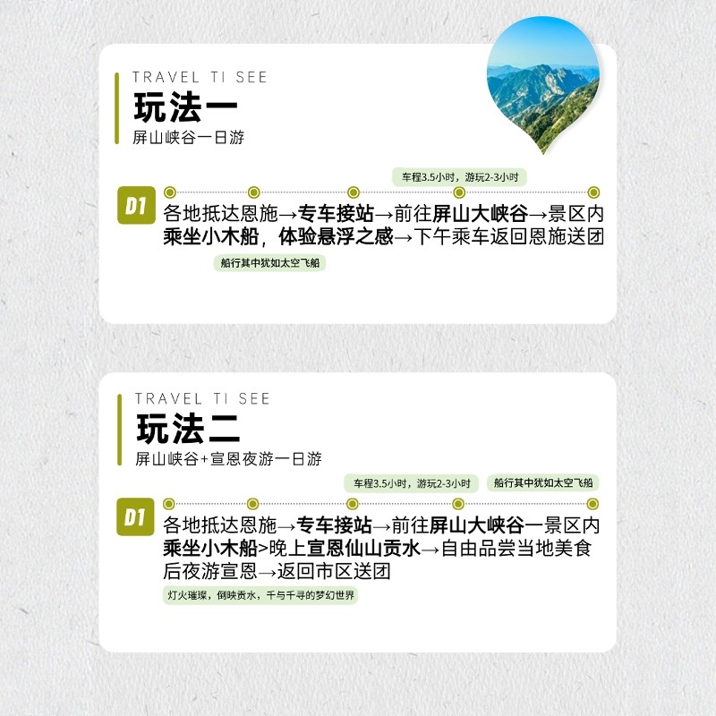 本产品巧妙结合日间自然奇观与夜间人文风情,白天畅游被誉为“中国仙本那”的鹤峰屏山大峡谷,感受悬浮船奇景;夜晚转场宣恩县城,沉浸于灯光璀璨的夜游项目,既满足差旅人士对高效利用时间的需求,又兼顾深度文化体验,让短暂旅程充满层次感。