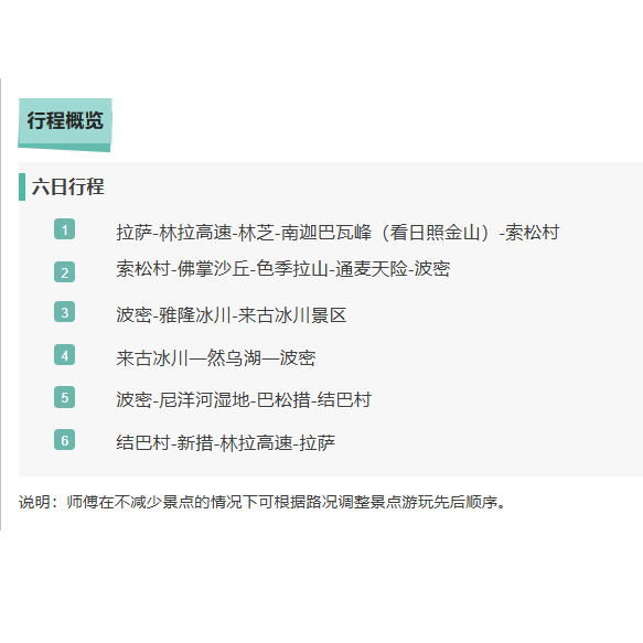 以拉萨为枢纽,高效串联林芝(两次提及)、昌都等藏东核心城市,6日内完成冰川、湖泊、沙漠、森林多元地貌穿越。对需考察多个地区的商务人士而言,此路线大幅节省中转时间与成本,实现“一次出行,全域触达”的差旅效能最大化。