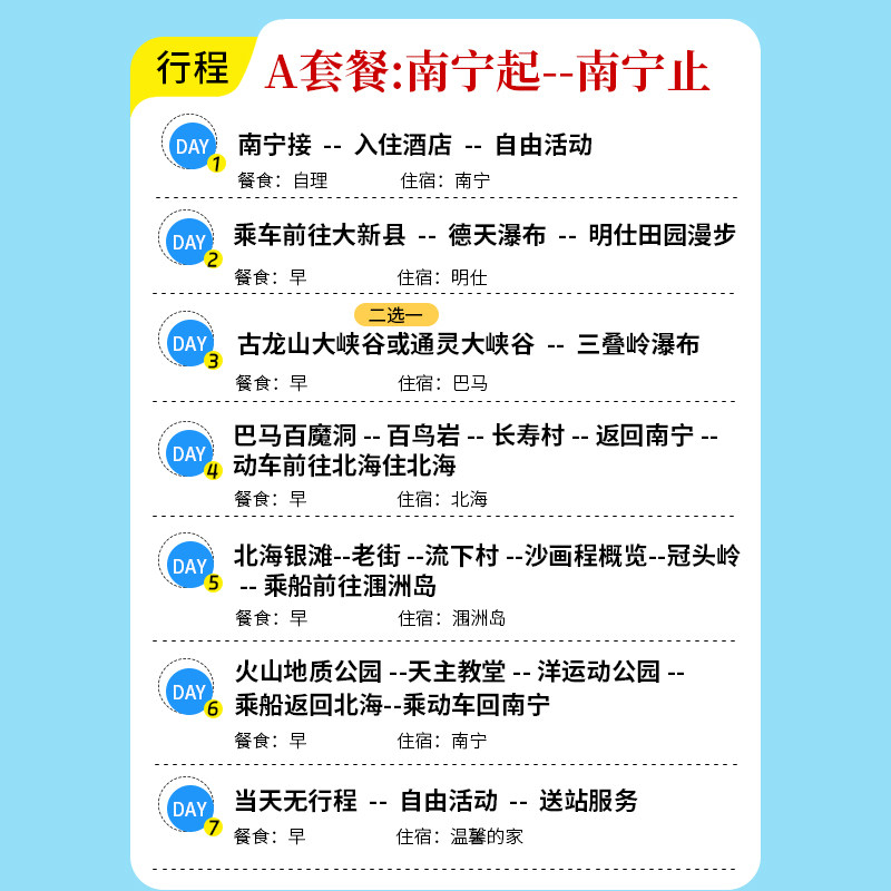 7日行程科学串联南宁、崇左(德天瀑布、古龙山)、北海(含涠洲岛)等核心目的地,形成高效闭环路线,避免重复折返。差旅人士可在有限假期中最大化体验广西自然与人文精华,从喀斯特山水到滨海风光,一次出行收获多重度假价值,提升差旅附加效益。