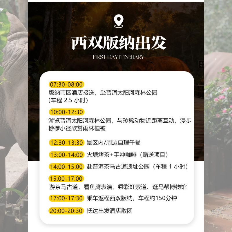 本产品精心设计一日行程,集历史文化、生态观光、动物互动、茶艺体验、轻徒步及水舞秀于一体,最大化利用有限差旅时间。无需多次转场或冗长交通,所有亮点景点合理串联,节奏张弛有度。对于仅有半天至一天空闲的商务人士而言,是高效获取丰富旅行体验的最优选择。
