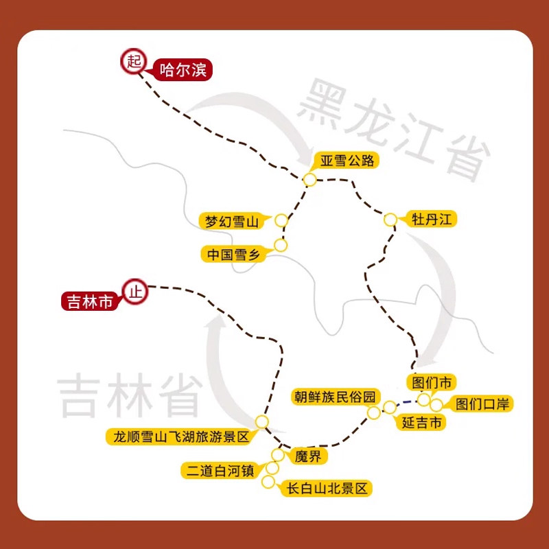 行程科学规划从哈尔滨出发,途经牡丹江(雪乡所在地)、延边(延吉)至长白山,形成一条高效、连贯的东北核心旅游环线。交通衔接顺畅,避免重复折返,最大化利用有限的差旅时间。无论是3天小长假还是7日深度游,都能在紧凑日程中领略冰雪、温泉、民俗、森林等多元景观。