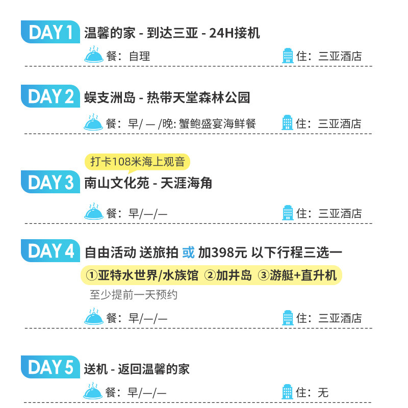 差旅无忧:三亚5天4晚纯玩行程,1人即可成行