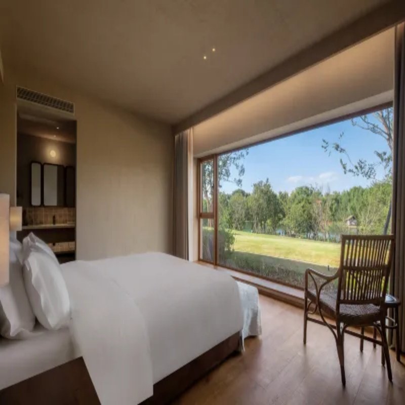 房间围绕光线与视野精心布局,每间均设面向湖水的露台或浴缸,确保差旅者在有限时间内最大化接触自然。晨起一杯咖啡眺望湖面,夜晚泡澡仰望星空,这种沉浸式视觉与触觉体验能快速缓解视疲劳与精神紧绷,帮助大脑重置状态,为明日会议或谈判蓄满能量。