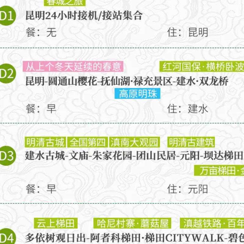 本行程专为独自出差或临时起意的旅行者设计,支持1人单独预订,无需拼团等待。从昆明出发,轻松串联红河、玉溪、曲靖等滇东南精华目的地,涵盖元阳梯田、罗平油菜花、加级寨梨花、圆通山樱花及建水古城等多元景观。无论是商务间隙短途放松,还是延长差旅假期深度体验,都能无缝衔接,灵活安排行程节奏,真正实现工作与度假的完美平衡。