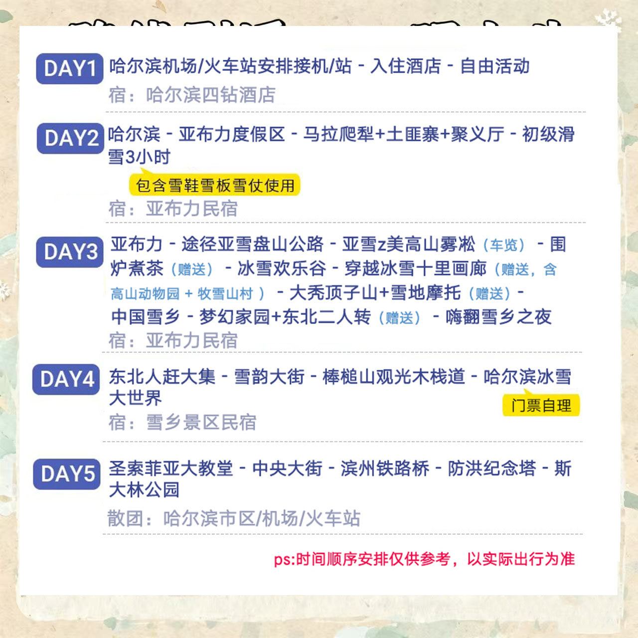 5天4晚的行程长度非常适合差旅人士利用‘周末+3天年假’的方式轻松出行。周五下班后从哈尔滨出发,周一返程即可回归工作岗位,最大限度减少请假天数。行程节奏张弛有度,既有雪乡夜宿的深度体验,也有亚布力滑雪的活力释放,让短暂假期也能收获满满回忆。