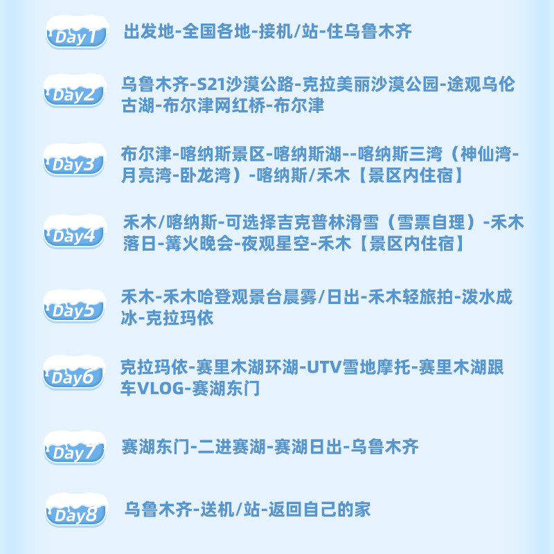 专为商务或独自出行旅客设计,本行程支持1人单独预订,无需拼团等待,极大提升差旅效率。从乌鲁木齐出发,深入阿勒泰、博尔塔拉等北疆秘境,8天小团行程紧凑而不仓促,兼顾工作与休闲需求。无论是临时出差顺道度假,还是独自探索边疆风光,都能即订即走,真正实现说走就走的差旅自由。