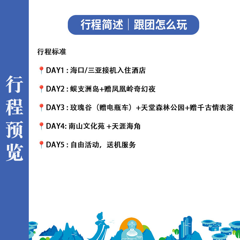 专为注重时间效率的差旅人群设计,全程零购物店(景购和免税店除外),不压缩景点游览时间,确保每一分钟都用在刀刃上。行程节奏张弛有度,既能深度游览蜈支洲岛、南山文化苑等5A级景区,又避免无效停留,让短暂假期也能收获满满体验。