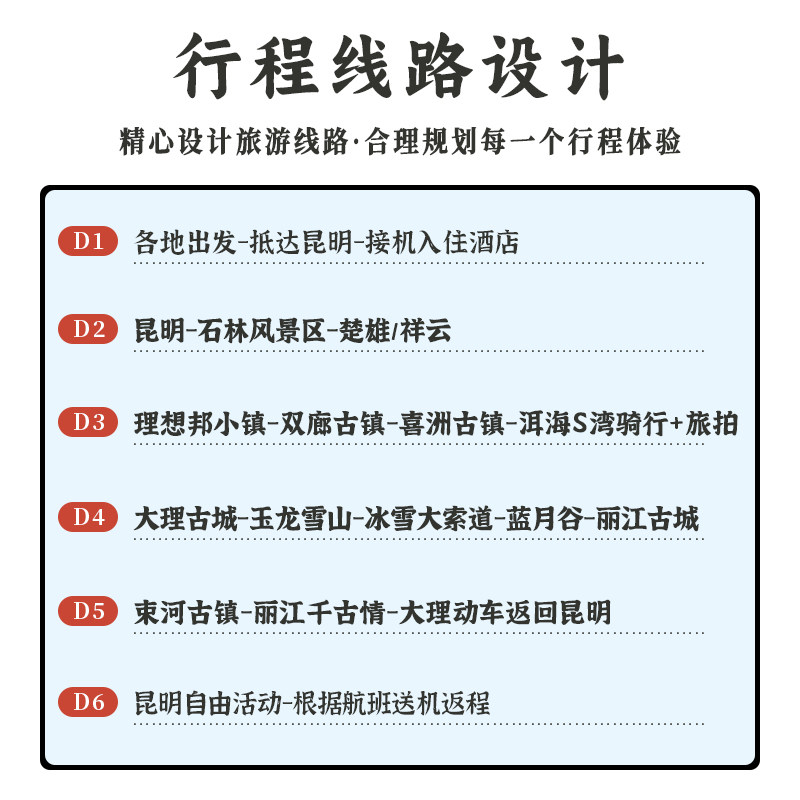 本线路专为商务差旅人士设计,支持从上海、北京、深圳、广州等一线城市直飞昆明,航班衔接顺畅,节省中转时间。抵达后即开启纯玩0自费的6天5晚行程,无需操心交通与琐碎安排,让高强度工作后的身心迅速切换至放松状态。无论是结束会议后的临时出行,还是周末延伸的小长假,都能实现‘落地即度假’的高效体验。