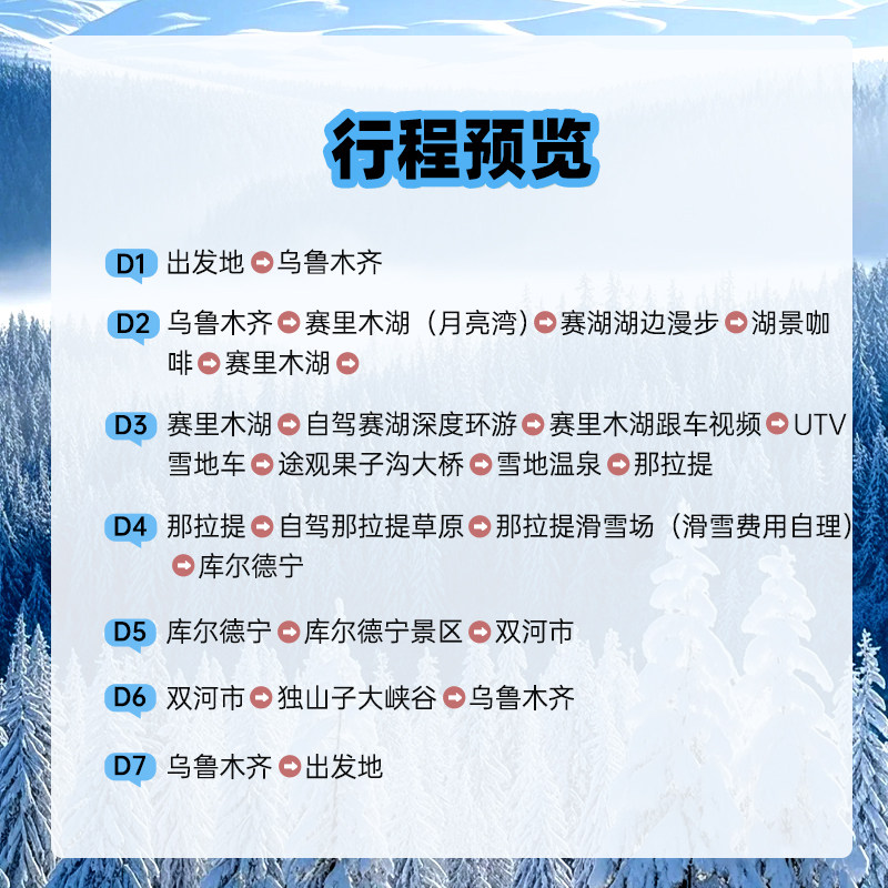 行程精准锁定乌鲁木齐、伊犁、博尔塔拉、克拉玛依等新疆北部热门区域,串联赛里木湖、那拉提、库尔德宁三大世界级自然景区。路线设计避免无效绕行,确保差旅用户在有限假期内最大化体验新疆的壮美与多元文化魅力。