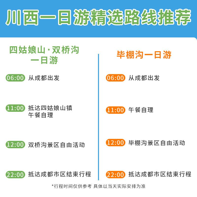 本线路支持1人单独预订,无需拼团等待,特别适合商务差旅人士在紧凑日程中灵活安排短途度假。从成都出发,当日往返阿坝毕棚沟与四姑娘山,节省时间成本,兼顾工作与休闲。小团纯玩模式避免大团拖沓,确保行程高效顺畅,是差旅途中放松身心的理想选择。