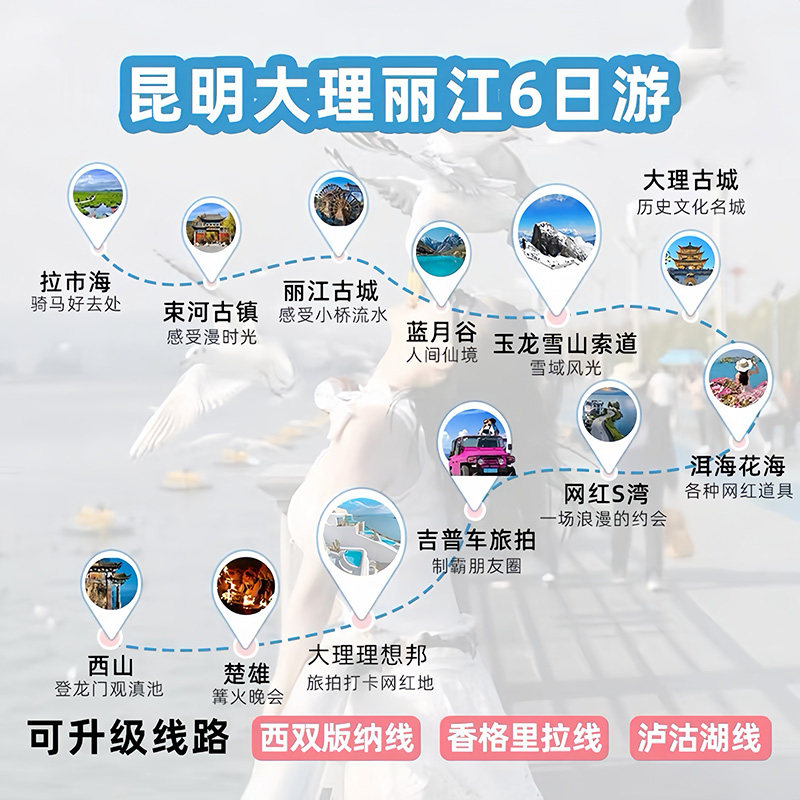 本行程以昆明为始发与终点城市,专为差旅人士设计,高效衔接商务与休闲需求。6天5晚的行程覆盖昆明、大理、丽江三大云南核心旅游目的地,既满足出差后放松身心的需求,又无需额外安排返程交通。全程跟团省心省力,住宿、交通、门票一价全含,特别适合结束工作后即刻开启度假模式的商旅人群。