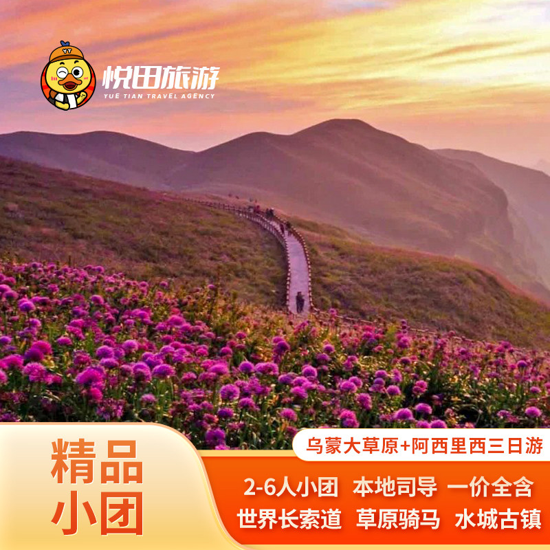 差旅特色本行程专为兼顾差旅与休闲的旅客设计,从六盘水出发,深入贵州乌蒙大草原核心景区。乘坐阿西里西梅花山索道,360度俯瞰喀斯特地貌与辽阔草原交织的壮丽景观,既满足高效出行需求,又提供沉浸式自然体验。行程安排灵活,适合2-6人小团,便于商务同行者在紧张会议之余放松身心,实现工作与度假的无缝衔接。