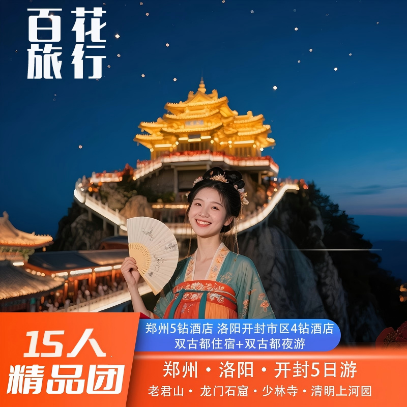 差旅特色本行程专为差旅人士设计,支持1人独立成行,无需拼团等待,灵活安排出差间隙的休闲时光。5天4晚行程紧凑高效,涵盖洛阳老君山、龙门石窟、少林寺及开封清明上河园等核心文化地标,既满足商务出行节奏,又深度体验中原千年文脉,让差旅不再枯燥,而是充满历史韵味与精神滋养的旅程。