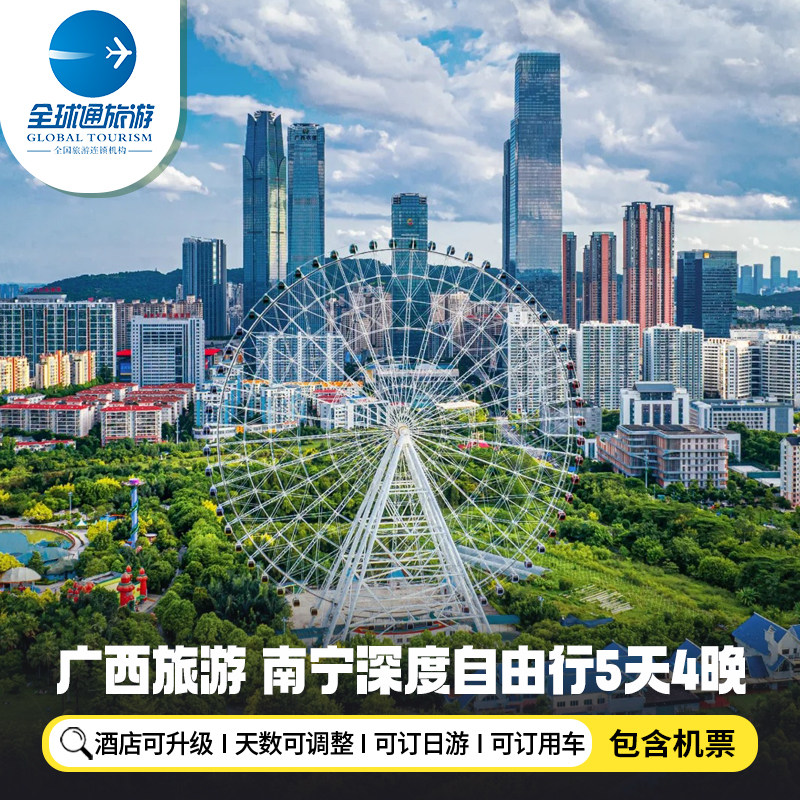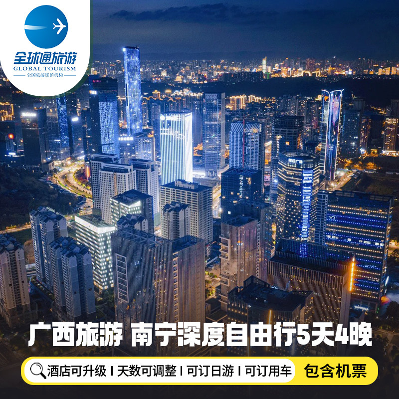 差旅特色针对商务人士与自由行旅客,本产品提供“机票+酒店”一站式预订服务,从北京、上海、深圳等12个主要城市出发,直飞南宁,省去繁琐比价与多平台切换的麻烦。只需一次操作,即可完成全部差旅基础安排,让您在繁忙工作之余也能轻松开启5天4晚的广西之旅,真正实现说走就走的高效出行体验。