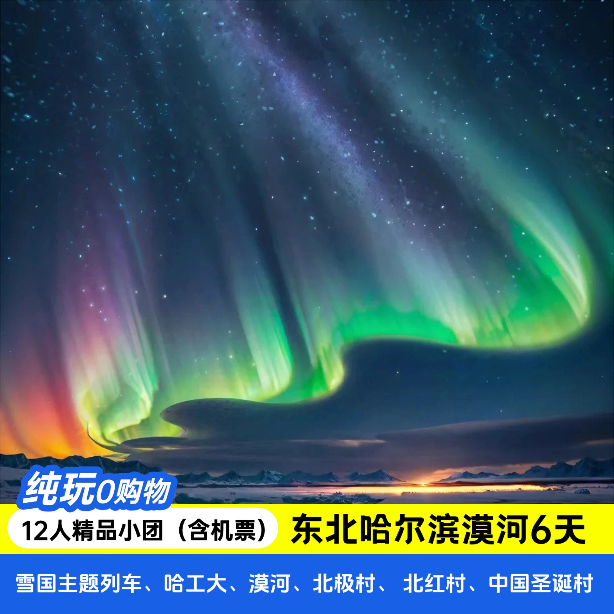 差旅特色本产品专为差旅人士设计,包含从乌鲁木齐、兰州、拉萨等30余座城市出发至哈尔滨的往返机票,省去繁琐订票流程。6天5晚行程覆盖雪乡、亚布力滑雪场、漠河北极村及室外温泉,兼顾商务出行后的身心放松与深度体验。全程跟团游,交通、住宿、门票全包,让您在高效完成差旅任务后无缝切换至冰雪奇缘之旅。